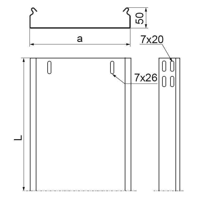 – Verbindung von Kabelrinnen nur mittels Verbinder (keine Aussparung an der Kabelrinnenseite) und Verbindungsbleche