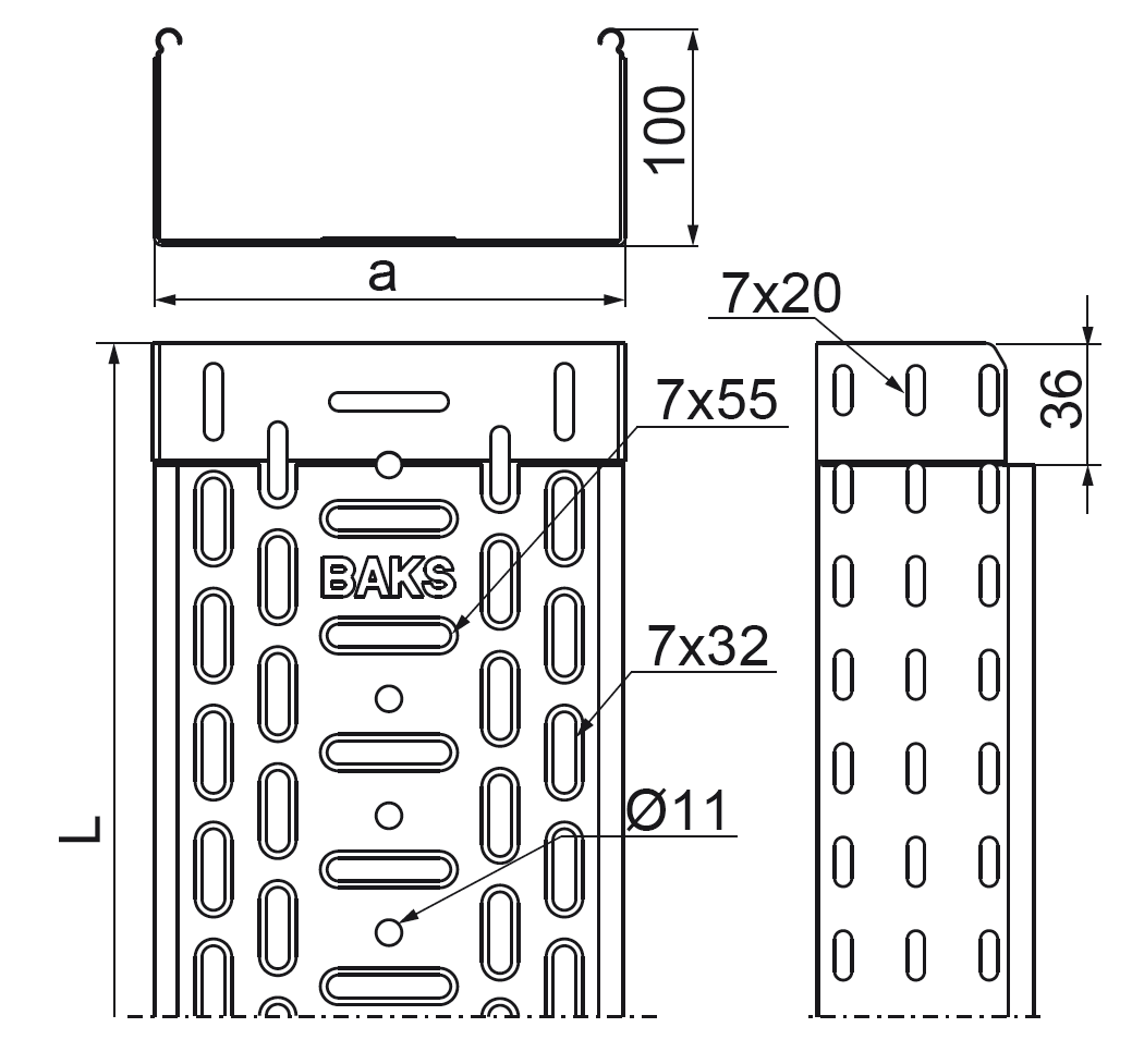 – Die Ø11-Bohrungen im Boden der Kabelrinnen ermöglichen die Aufhängung an einem Stab M10 (max.
