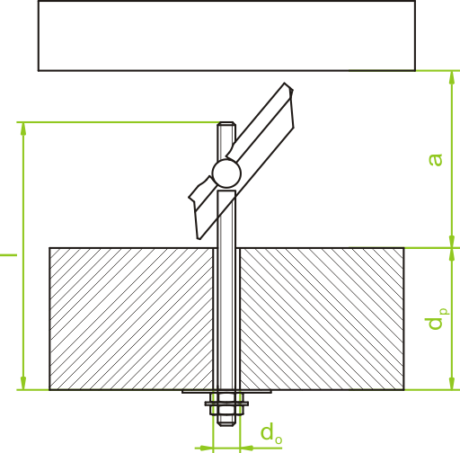 | Symbol | Katalog-Nr. | Bohrer Ø d0 (mm) | Maximale Plattendicke dp (mm) | Minimaler Raum a (mm) | Dübellänge I (mm) | Menge (Stück) | ||