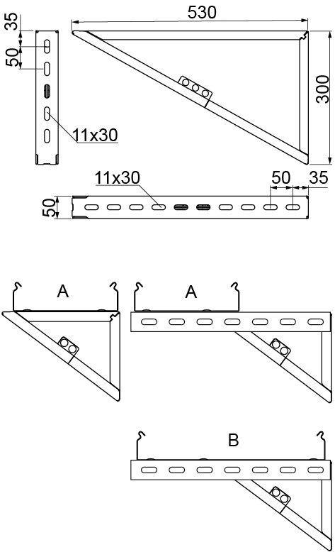 Unterstützung von Kabeltrassen. In Kombination mit einem U-Profil (z.B. CM...41H41...) zur Verlängerung des