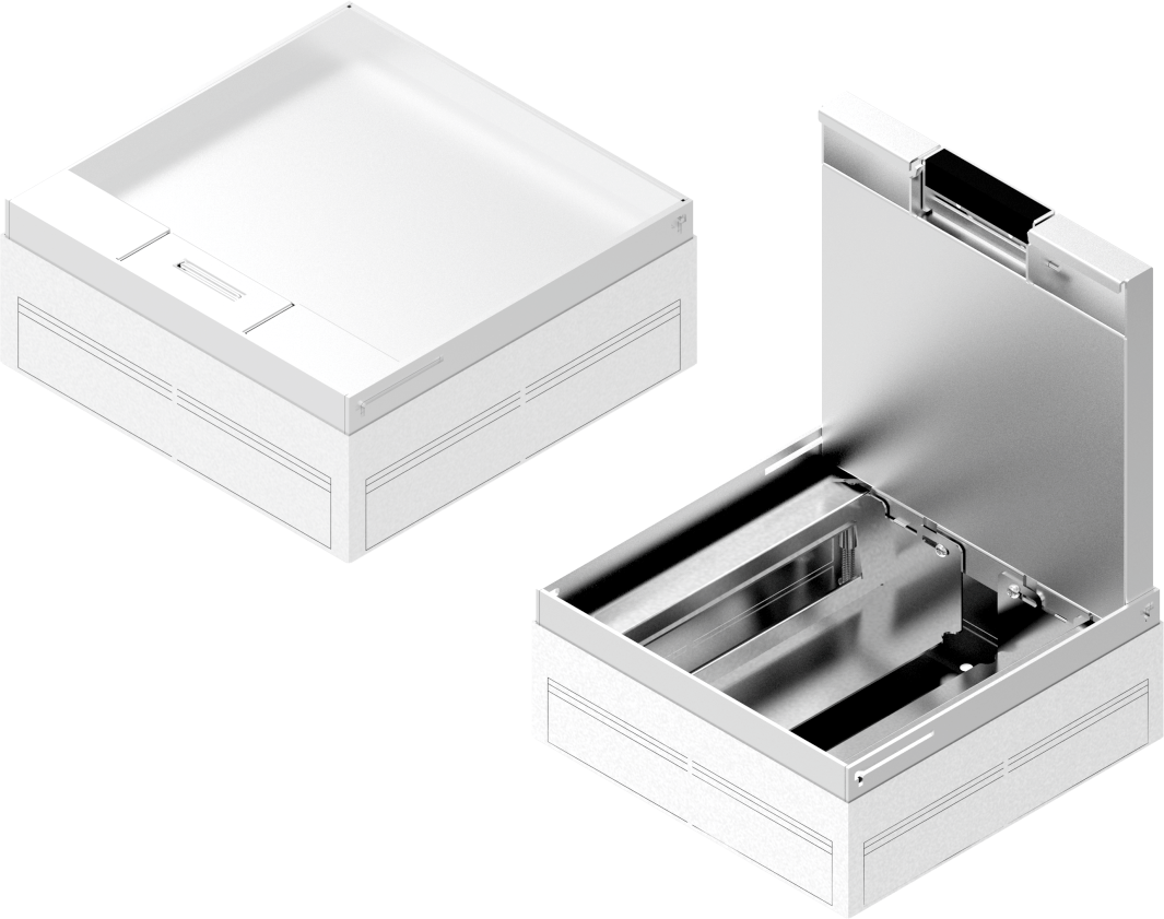 Complete floor box ready for mounting in engineered floors, raised floors and concrete screeds. The box with galvanised and aluminium components is ready for use in dry environments.
