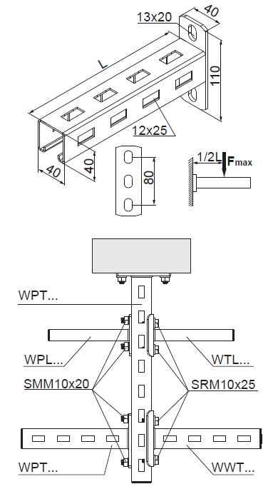Symbol Catalogue number Length L (mm) Weight 1 pc. (kg) Maximum load Fmax(kN) Quantity (pcs.) distance to bracket base 3D file