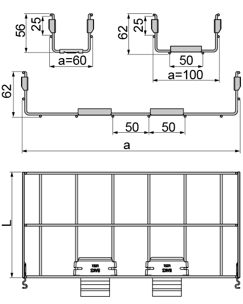 – ilość łączników dolnych w korytkach o szerokościach: 100-200 mm - 1 szt., 300-600 mm - 2 szt.
