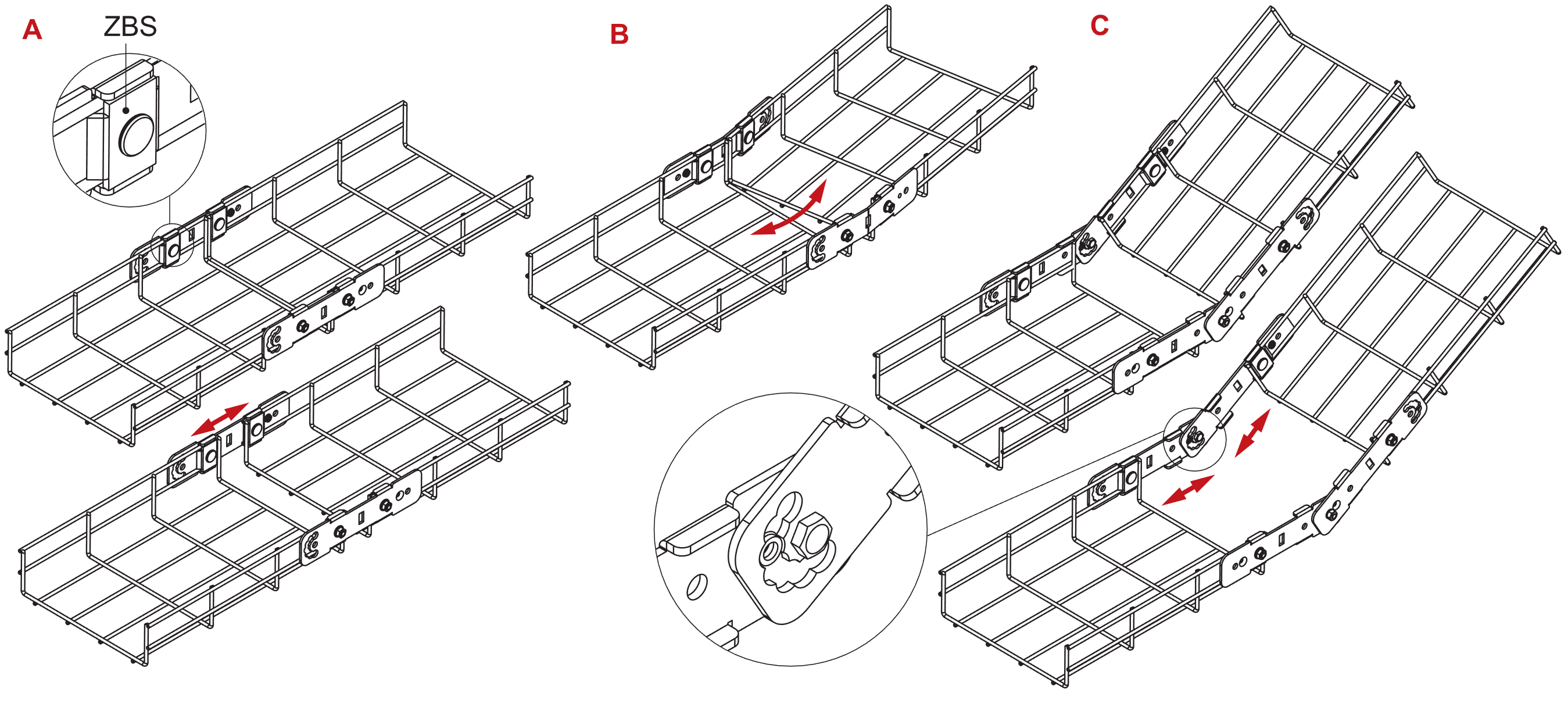 – łączenie korytek siatkowych z wykorzystaniem zacisków ZBS