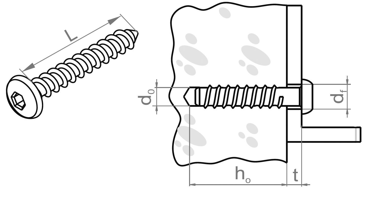 | Symbole | Numéro de catalogue | Foret Ø d0 (mm) | Trou dans l'élément fixé d1 (mm) | Profondeur du perçage h0 (mm) | Longueur utile maximale | Nombre (pcs.) | ||