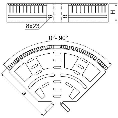 Płynna regulacja kąta prowadzenia trasy kablowej w zakresie 0-90°.