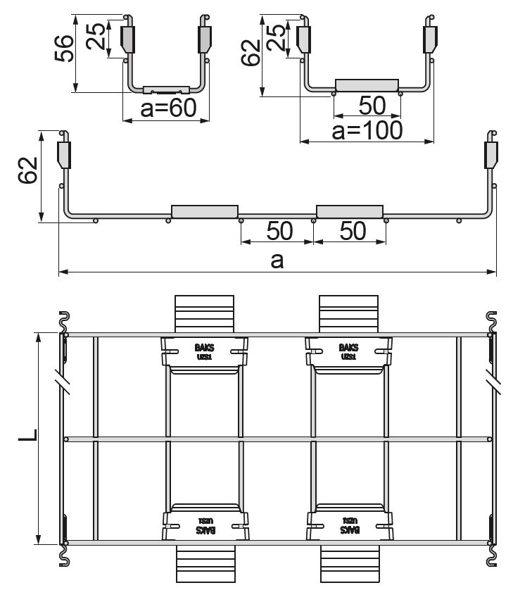 - ilość łączników dolnych w korytkach o szerokościach: 100-200 mm - 1 szt., 300-600 mm - 2 szt.