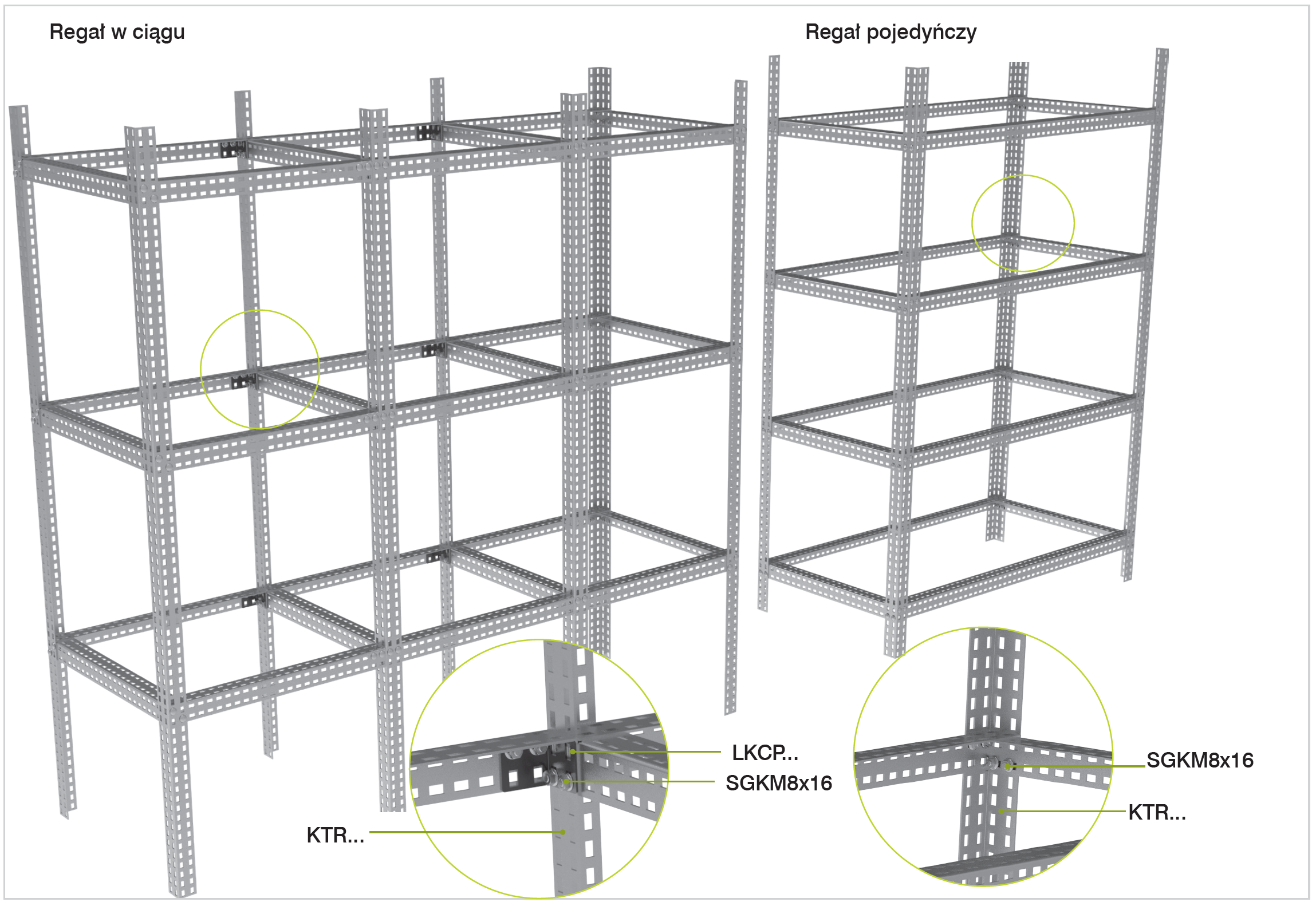 Do tworzenia ciągów regałów z kątowników KTR...50H50.