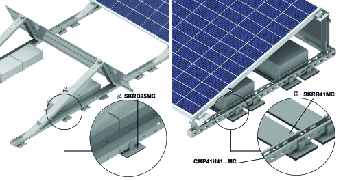 Montaż w dolnym profilu konstrukcji w celu odseparowania i podniesienia metalowych elementów od powierzchni dachu oraz zamocowania konstrukcji poprzez ułożenie balastu. Możliwość regulacji wysokości podniesienia profilu dolnego w trzech położeniach: 19, 26, 33 mm.