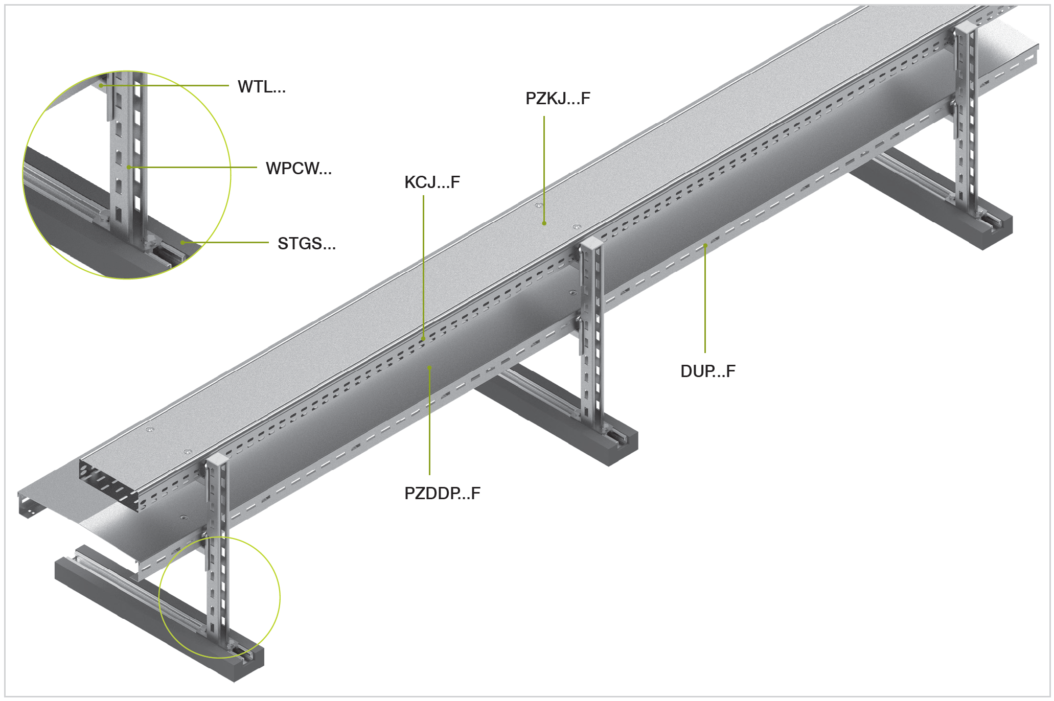 System podpór do ustawiania na dachach tras kablowych, urządzeń klimatyzacyjnych, itp. Znajduje również zastosowanie przy budowie chodników dachowych.